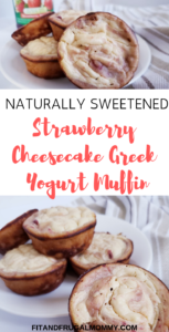 A delicious, naturally sweetened, strawberry cheesecake greek yogurt muffin.